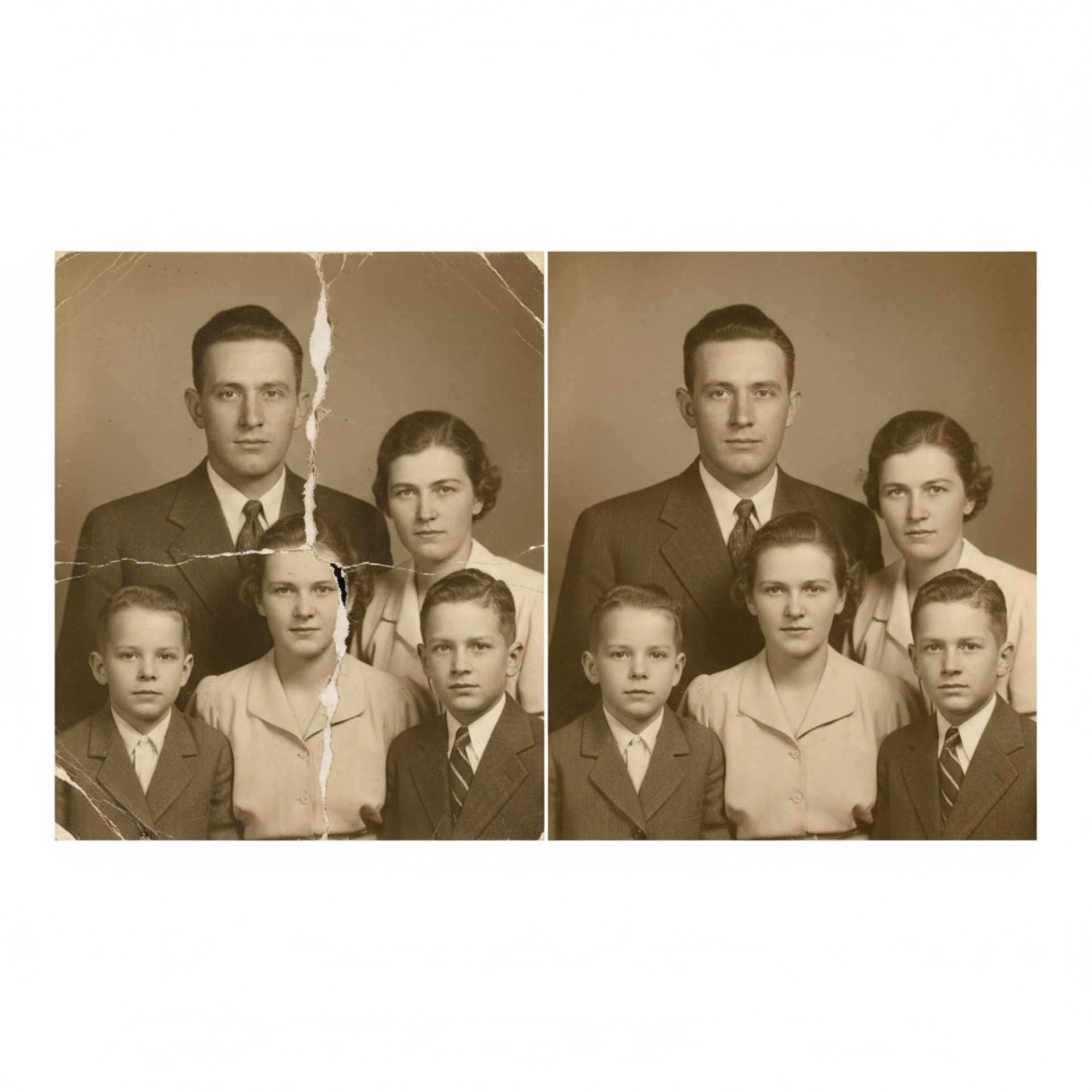 No Caso 2 Rasgada, enfrentamos uma fotografia de família dos anos 40 que havia sido violentamente separada ao meio, com uma rasgadura irregular que atravessava o rosto de uma das figuras centrais. Este tipo de dano é devastador, pois a linha de ruptura, em vez de ser reta, geralmente causa um efeito de "serra" nas bordas, exigindo uma precisão de alinhamento quase microscópica. É neste momento que a expertise da S.O.S Restauração de Fotos Antigas se torna fundamental.
