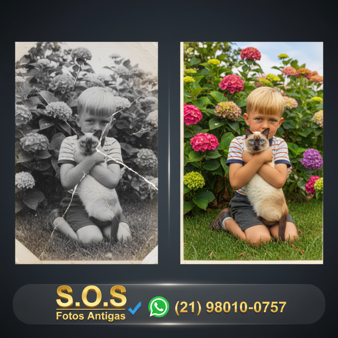 "Eu pensei que esta foto do meu irmão mais velho, ainda criança, e do nosso primeiro gatinho estava perdida para sempre. O tempo e a umidade a tinham destruído. Quando recebi o arquivo de volta, não acreditei... Eu chorei de emoção ao ver a nitidez do sorriso dele e, o mais incrível, os olhos azuis perfeitos do Siamês. A S.O.S Fotos Antigas não apenas restaurou uma foto; eles trouxeram de volta um pedaço lindo e colorido da nossa história familiar. Parece que a foto foi tirada ontem. É impecável."